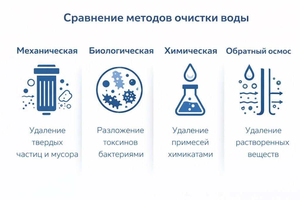 | Механическая фильтрация | Средняя | Удаление частиц | Не удаляет растворенные вещества |