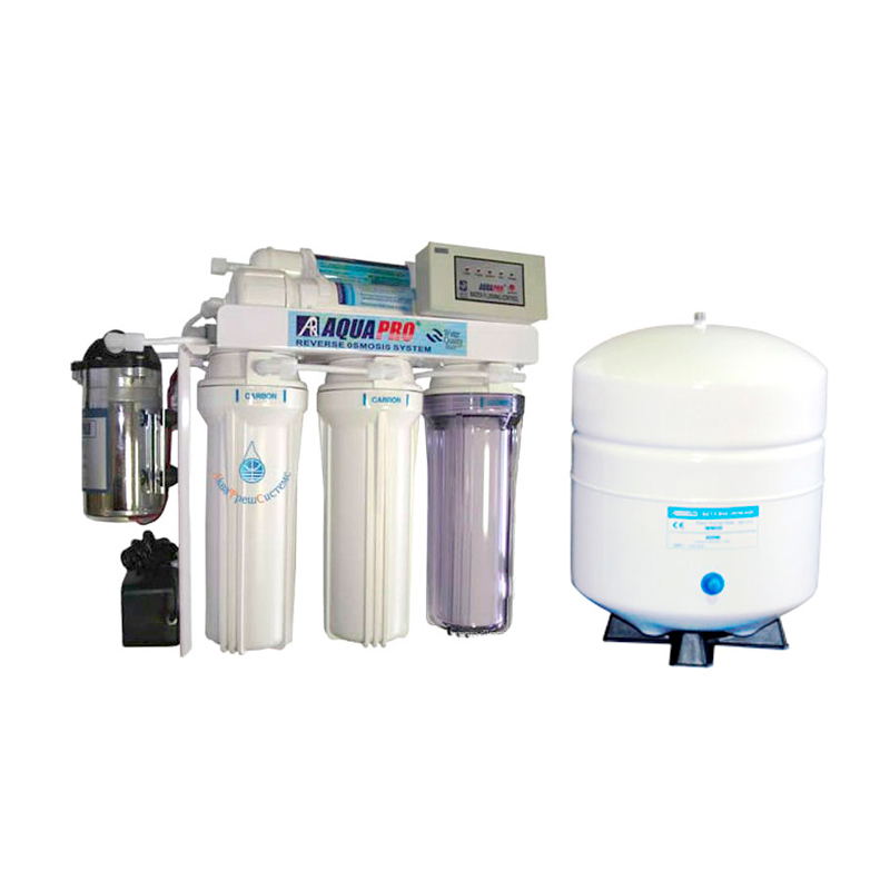 5-ступенчатая установка обратного осмоса AQUAPRO AP-800 с насосом и блоком обратной промывки мембраны. Система очистки воды удаляет до 99% примесей, содержащихся в воде. Фильтр AquaPro, устанавливается под кухонной мойкой или ином месте, с выводом крана питьевой воды на столешницу или на мойку. Благодаря встроенному блоку обратной промывки MС-2 значительно увеличивается срок эксплуатации мембранного элемента. Обратная промывка осуществляется как в автоматическом(3 раза/сутки), так и в ручном режиме.